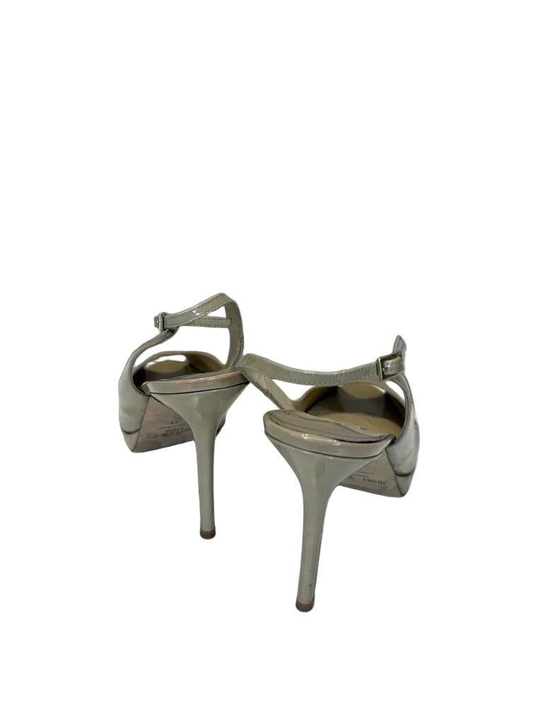 Stylish Jimmy Choo patent leather peep-toe heels, perfect for formal occasions or a night out. Features a comfortable slingback design and elegant stiletto heel.