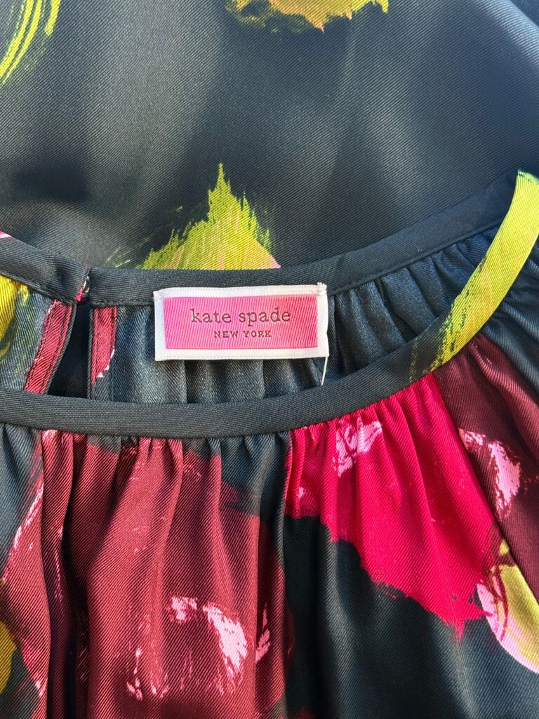 A stylish black blouse featuring a vibrant floral print, perfect for casual or formal wear.