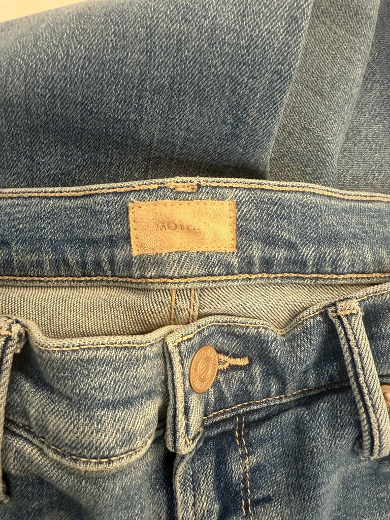 Stylish light blue straight leg jeans by MOTHER, featuring a high-rise fit and frayed hem for a trendy look.