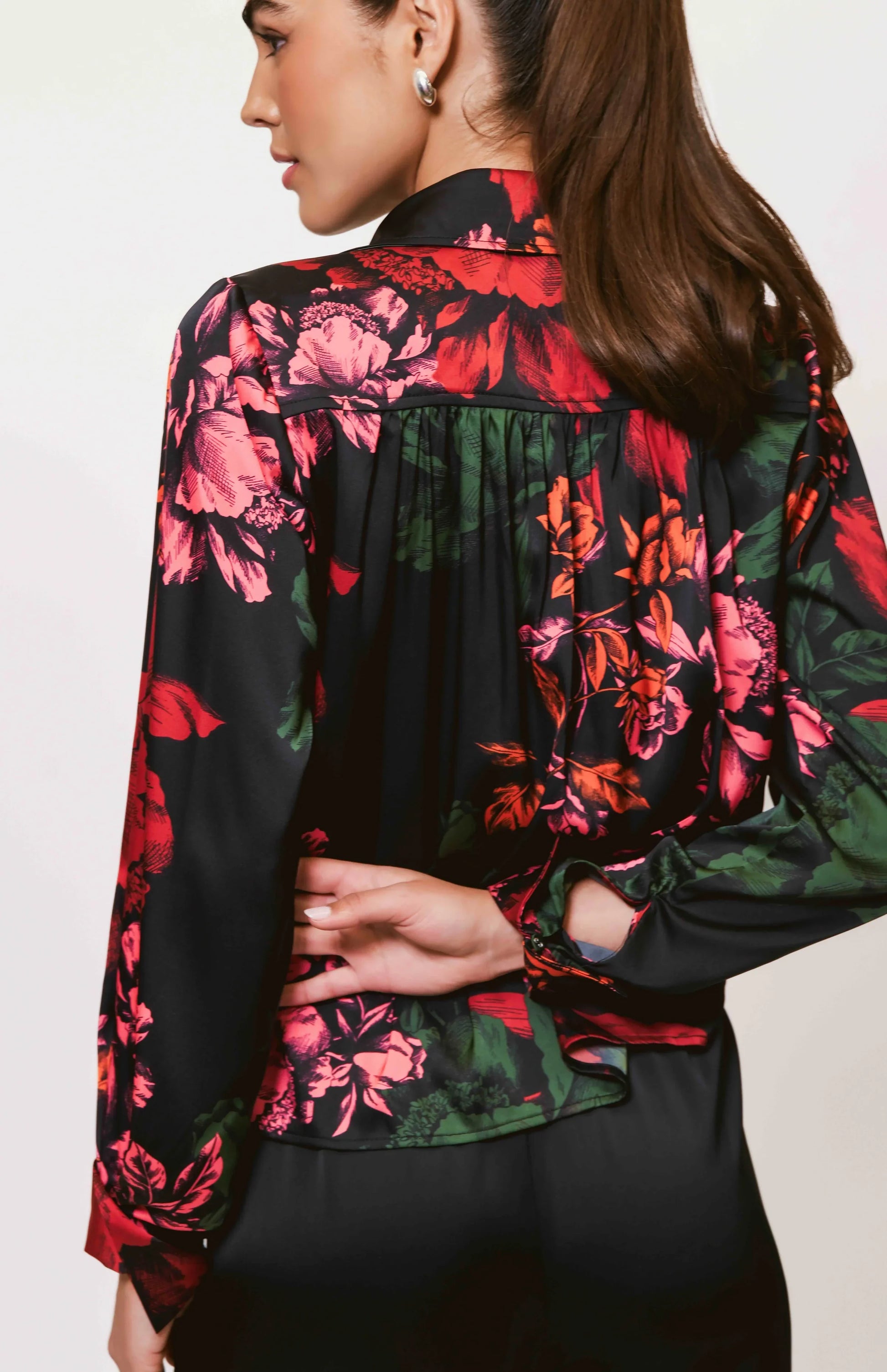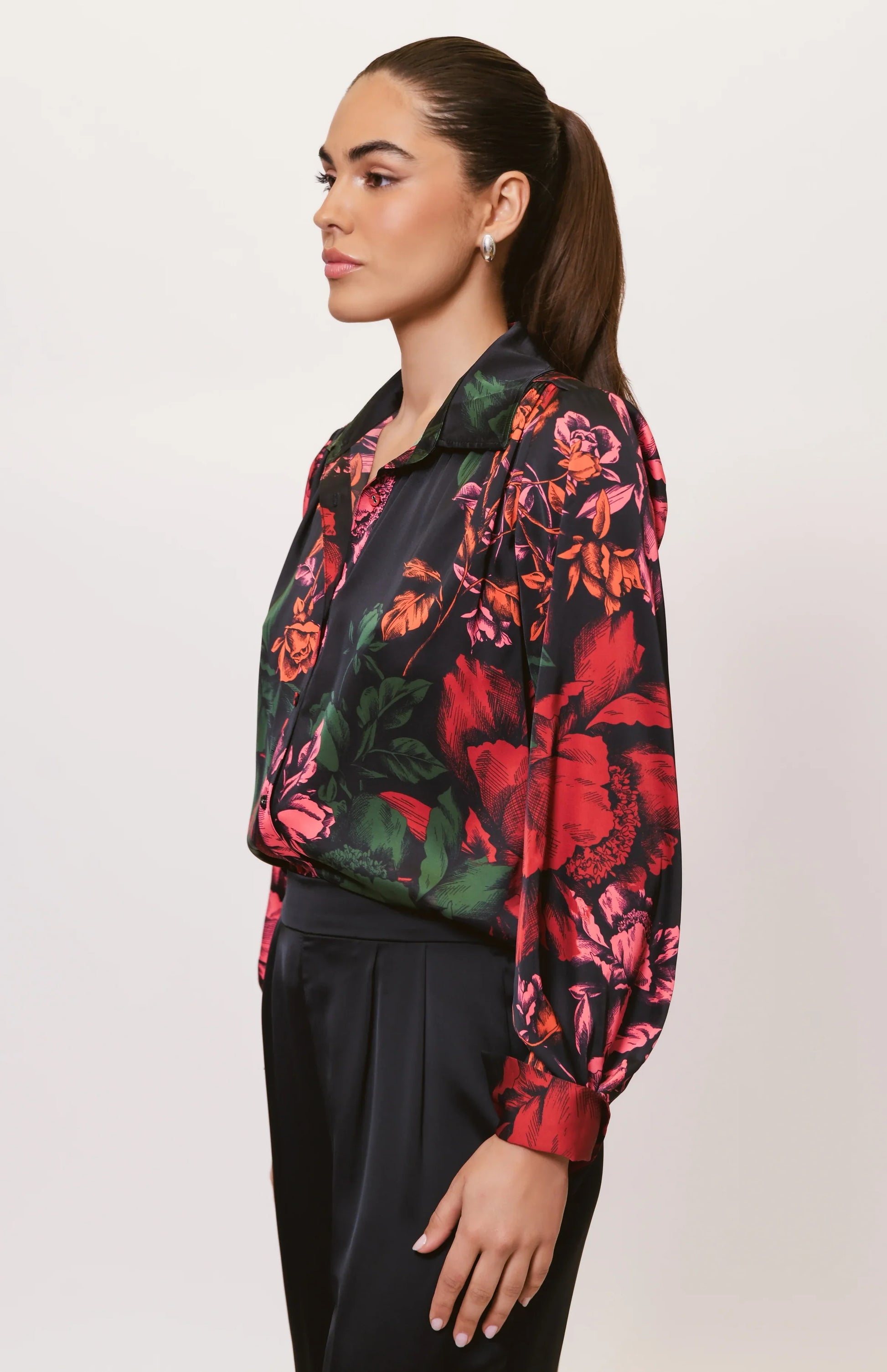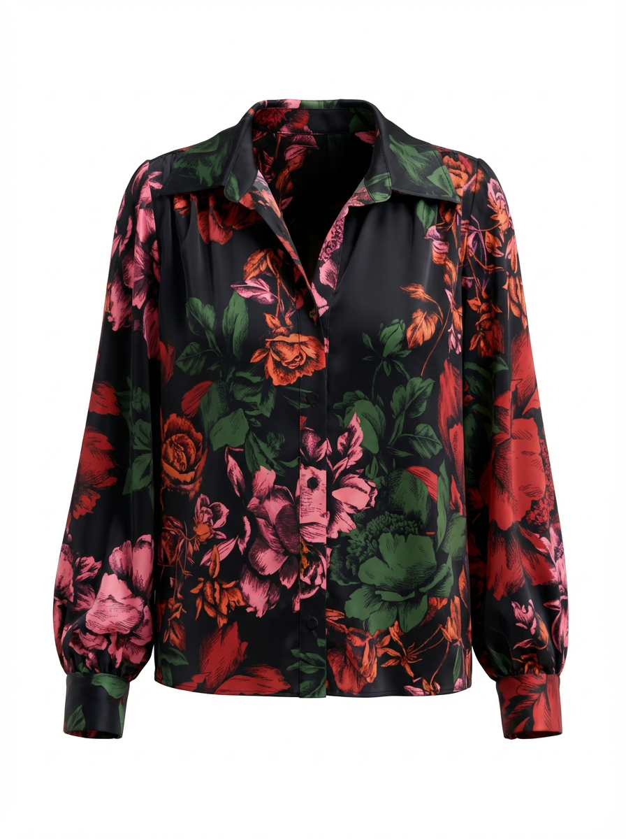 Collared button down floral satin blouse