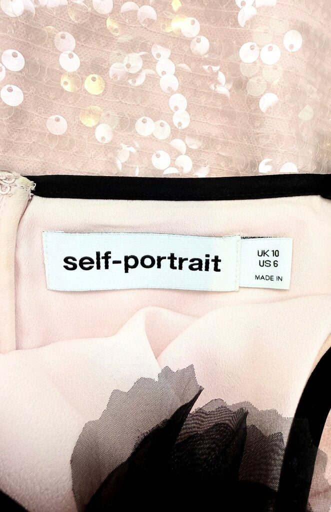 Stylish pink sequin dress by Self-Portrait, featuring a unique design with a black floral accent. Perfect for special occasions.