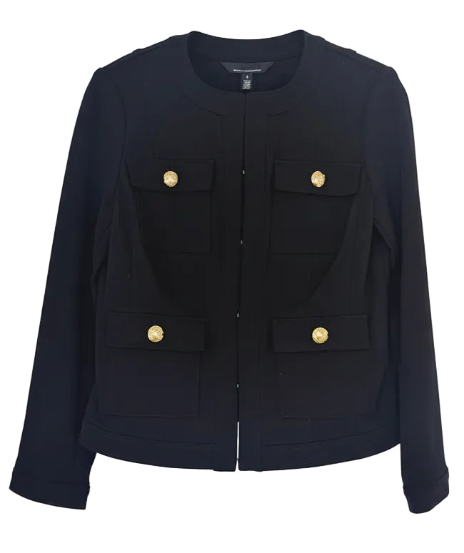 Elegant black jacket by White House Black Market, featuring gold-tone button details and functional pockets. Perfect for formal occasions or professional settings.